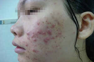 4、青春痘: 好发于面部的粉刺、丘疹、脓疱、结节等多形性皮损为特点。不慎挤捏后,易产生痘坑痘印。